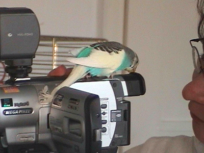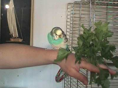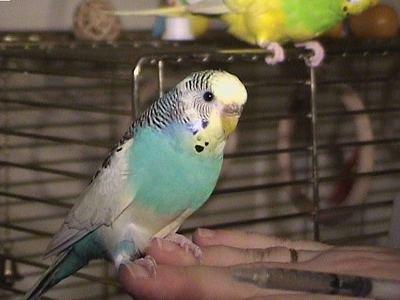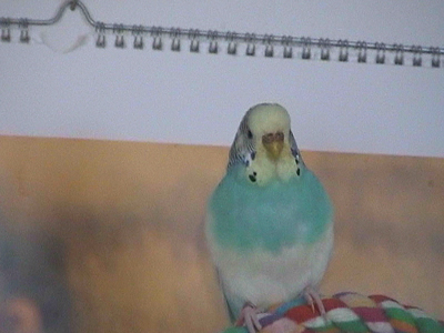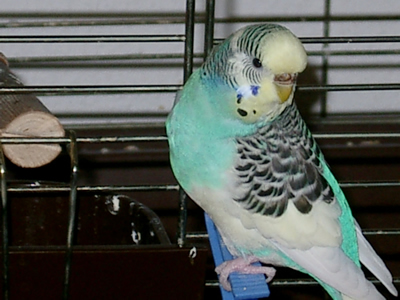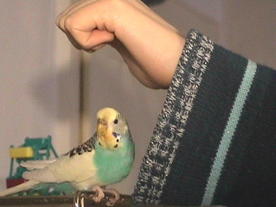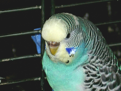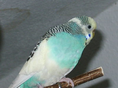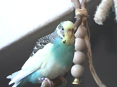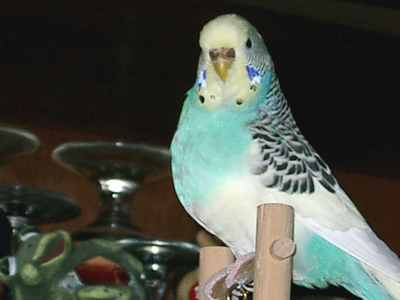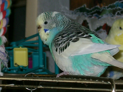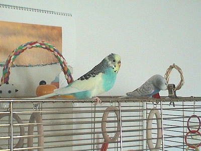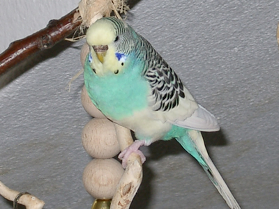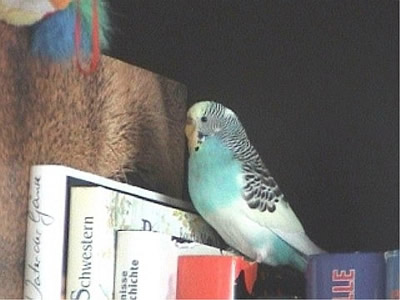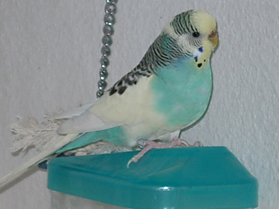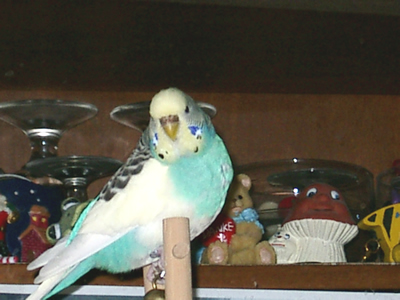 Gimli fiel uns im Februar 2001 in unserem Zooladen auf. Eigentlich wollten wir dort nur Maiseinstreu besorgen, aber der obligatorische Blick auf die Wellivoliere durfte natürlich nicht fehlen. Ja, da turnte dann Gimli wie wild in der Voliere herum. Keine Minute konnte sie stillsitzen. Auf Zuruf kam sie sogar ans Volierengitter. Eigentlich war es da schon um mich geschehen, aber da wir eigentlich gar keinen dritten Welli zu diesem Zeitpunkt wollten, gingen wir wieder nach Hause. Mir ging sie jedoch nicht mehr aus dem Kopf. Am nächsten Tag sind Winnie und ich dann nochmal in den Zooladen, einfach nur mal so schauen. Und wieder turnte Gimli wie eine Wilde in der Voliere herum. Nach etwa einer halben Stunde hatte sich das kleine Wellimädchen endgültig in unser Herz geturnt. Sie durfte mit uns nach Hause gehen. Keine Sekunde haben wir seitdem bereut, die Kleine mitgenommen zu haben. Sie war vom ersten Augenblick an sehr vertraut mit uns, obwohl wir keinerlei "Zähmungsversuche" unternommen hatten. Sie hat überhaupt keine Angst vor der Hand. Sie kriecht auch sehr gerne in die Ärmel von Blusen oder T-Shirts und spielt am allerliebsten mit dem Telefon, natürlich nur, wenn man es am Ohr hat. ;-))) Sie hat auch keine Angst vor fremden Besuchern. Sie ist wirklich eine ganz zutrauliche süße Wellifrau. Seit Higgins bei uns eingezogen ist, fühlt sie sich sehr zu ihm hingezogen und man krault sich auch schon gegenseitig. Ob die beiden nun ein festes Paaar werden, wird sicherlich die Zeit zeigen. Ein schönes Paar sind sie mit Sicherheit. Gimli ist allerdings auch eine kleine Zicke. Sie zankt sehr gerne mit Monty und Sancho und jagt auch schonmal Neelix ein paar Runden durch das Wohnzimmer. Für Spot interessiert sie sich momentan überhaupt noch nicht. Aber natürlich kann man ihr nicht böse sein, hat sie doch den gewissen Blick. Sie schaut einen damit an und man kann nicht mehr mit ihr schimpfen. Sie ist halt einfach ein ganz besonderer Welli.