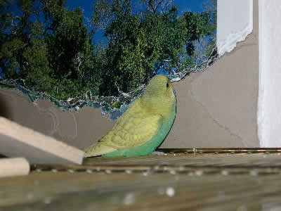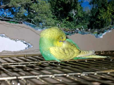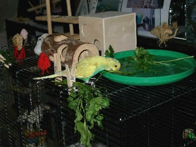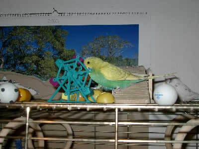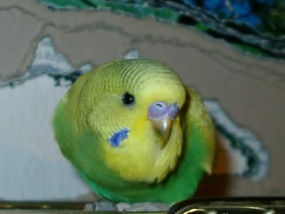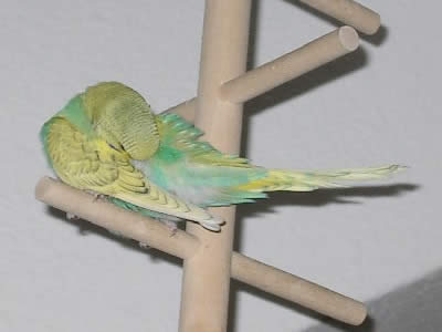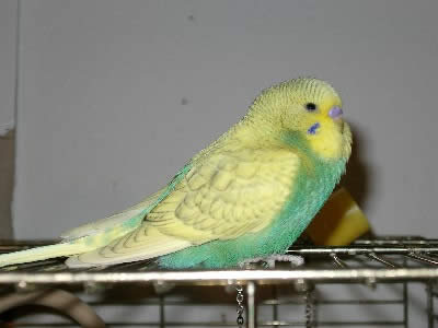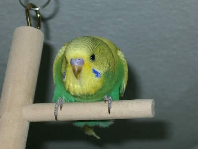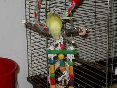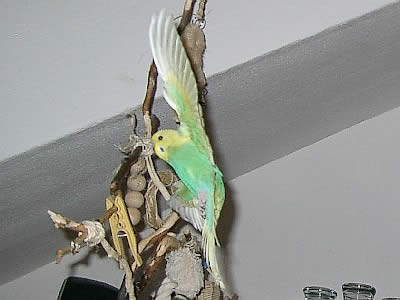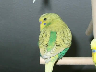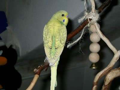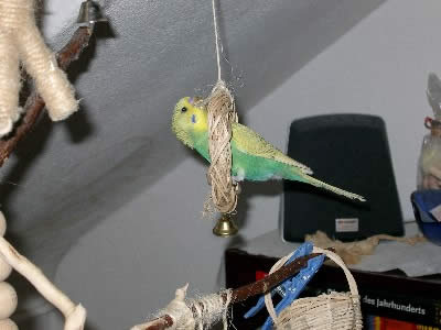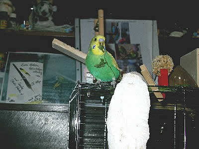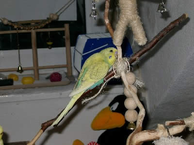 Helios haben wir schon als kleines Küki kennengelernt. Wir waren am 22.November 2003 bei Meike zum Kükiknuddeln. Am 06. November 2003 war Helios geschlüpft, als drittes von vier Kükis. Seine Eltern sind Pinky und Lilly. Schon als ich Helios das erste Mal in der Hand hatte, wußte ich, dieses kleine Geschöpf wird später mal ein Musketier. Die ganzen Stunden, die wir bei Meike verbrachten, konnten Helios und ich uns kaum voneinander trennen. Am 21.Dezember 2003 war es dann endlich soweit: Helios konnte bei den Musketieren einziehen. Ich haben selten einen so problemlosen Einzug wie bei ihm erlebt. Ich hielt meine Hand in den Transportkäfig und schwupps, saß der kleine Hutzi schon drauf und flog mit den Musketieren um die Wette. Es hätte keine Fensterabdeckung benötigt, Helios ist ein begnadeter Flieger. Auch das Zusammenleben mit den Musketieren gestaltet sich problemlos. Die Zänkereien sind ganz selten, nur der arme Neelix muß mal wieder Babysitter spielen, da Helios ihm auf Schritt und Tritt folgt. Gimli und Higgins, sonst begnadete Schwanzzieher, halten sich zurück. Monty und Sancho schauen sich den Kleinen erstmal aus der Ferne an. Spot hat als Einziger schon versucht, etwas zu zanken, aber Helios hat ihn sofort ihn seine Schranken gewiesen. Schon am ersten Abend fand Helios binnen kürzester Zeit den Eingang in die Voliere und morgens der Weg hinaus ist auch überhaupt kein Problem. Zumal er ein sehr unängstlicher Charakter ist. Helios ist ein grüner Spangle und wir sind sehr gespannt, wie sich sein Gefieder nach der Jungmauser verändern wird. Eines ist auf jeden Fall schon jetzt klar: kein Spielzeug ist vor ihm sicher.