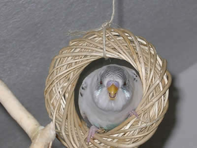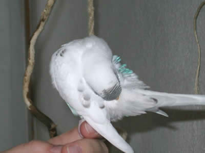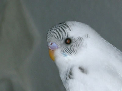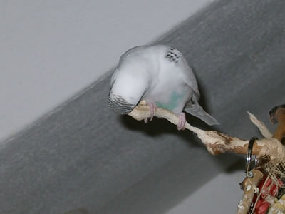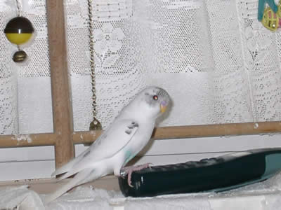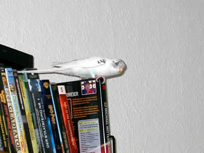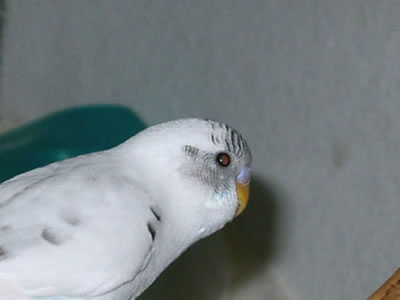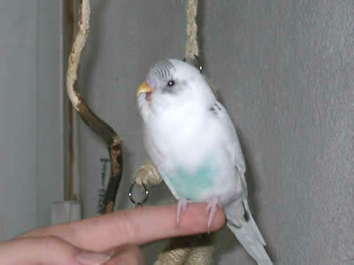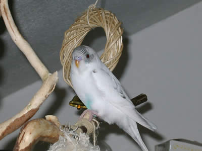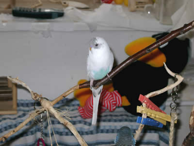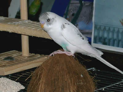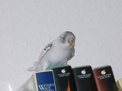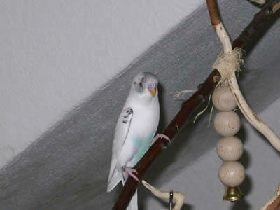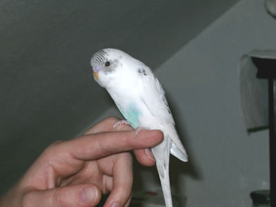Spot ist ein Küki von Meikes Wellipärchen Mavi und Bonnie. Das Ei wurde am 16. September 2002 gelegt und Spot schlüpfte am 04. Oktober 2002 aus dem Ei, als drittes von vier entzückenden Küken. Da wir vier Wellimädels und nur zwei Wellimänner hatten, wollten wir mit einem Hahn das Geschlechterverhältnis ausgleichen. So zog dann am 16. November 2002 Spot bei uns ein. Zu seinem Namen kam er, weil er ein rezessiver Schecke fast ganz in weiß ist, nur am Bauch und am Rücken ist jeweils ein hellblauer Fleck. Die Zusammenführung mit Neelix, Monty, Gimli, Sancho und Higgins ging ganz problemlos. Was wir niemals für möglich gehalten haben ist eingetroffen: Spot hat noch Landeplätze ausfindig gemacht, die die anderen bisher nicht entdeckt hatten. ;-))) Man kann also schon sehen, daß Spot prima zu den Musketieren paßt. Spot ist überhaupt nicht ängstlich, weder vor Menschen noch vor Spielzeug hat er Angst. Wahrscheinlich macht er schon in Bälde mit bei den Streichen vom Teufelsteam Gimli und Higgins.